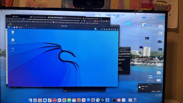 2/ Enter this in your Mac terminal. This is to tunnel RDP over SSH: ssh -L 3390:127.0.0.1:3390 -i /Path-to-your-key-on-your-computer/yourkey.pem kali@EC2IPaddress Here are some good instructions. After you successfully run this command you launch Microsoft Remote Desktop and connect to 127.0.0.1:3390 . That’s it!
